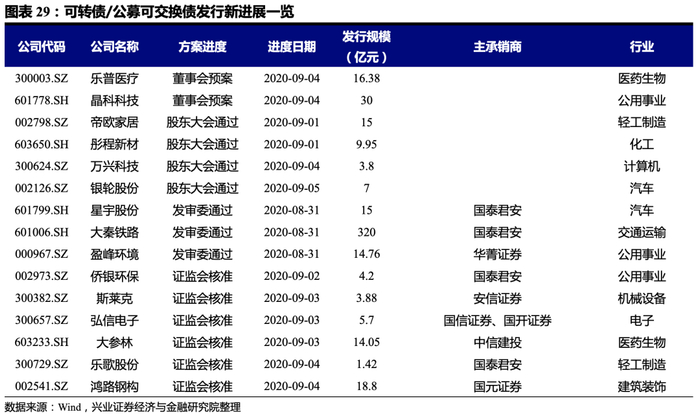 本周特发转2上市。截止本周末,近一年来一级市场共148只公募转债发行预案,1只公募可交换债发行预案,合计拟发行金额2877.74亿元。本周乐普医疗(16.38亿元)、晶科科技(30亿元)发布董事会预案;帝欧家居(15亿元)、彤程新材(9.95亿元)、万兴科技(3.8亿元)、银轮股份(7亿元)获得股东大会通过;星宇股份(15亿元)、大秦铁路(320亿元)、盈峰环境(14.76亿元)获得发审会通过;侨银环保(4.2亿元)、斯莱克(3.88亿元)、弘信电子(5.7亿元)、大参林(14.05亿元)、乐歌股份(1.42亿元)、鸿路钢构(18.8亿元)获得证监会核准。所有已公布的可转债发行预案中,通过证监会核准但尚未发行的有18家,总规模190.28亿元。