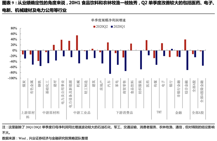 重视白马股实际上还是在为业绩确定性做考量(再加上消费回流趋势、社零增速与疫情前还有显著差距等论据,空间逻辑也可以辅助确定性逻辑):1)行业基本面上来说食品饮料整体具有一枝独秀的稳定盈利能力,农林牧渔虽然整体被看做周期行业,但其实消费属性不弱,而且上半年盈利非常可观,这使得分属养殖前后周期的牧原股份、海大集团上涨势头也很强劲。而Q2基本面快速修复的医药、电子、电新、机械建材等行业也均有明显的波段赚钱机会。2)从行业内部看龙头盈利好过二线品种,这强化了“基本面-股价”正循环逻辑。