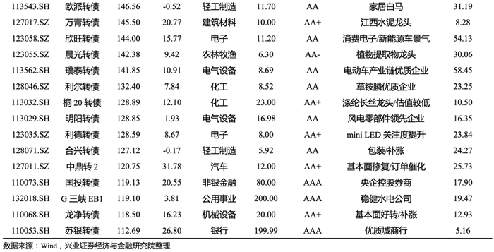 1)景气度上行、正股估值安全边际较高的优质品种:公用环保的瀚蓝转债、G三峡EB1、川投转债、福能转债;周期品种景气度较高的太阳转债、利尔转债、金禾转债;竣工产业链的欧派转债;光伏、风电领域的福莱转债、明阳转债;Mini LED标的利德转债;汽车;汽车行业的中鼎转2、骆驼转债;通信领域的中天转债。