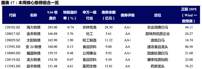 在强调金融底仓的价值之外,我们延续9月月报判断,即白马标的仍然是持仓重点,不过需要注意两个问题:1)仓位需要控制或者风格值得平衡,至少建材、化工、光伏、环保等偏低估值行业龙头仍然呈现出良好表现;2)由于波动较大,即将进入转股期或进入转股期的大规模高价品种可以适当获利了结,如海大转债、希望转债、安20转债等。具体择券上: