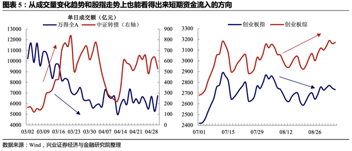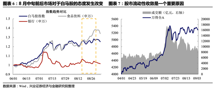 我们能够观察到这类关注度极高、业绩确定性很强的标的其实在7月中旬至8月中旬已经蛰伏了一个月有余,彼时“风格轮动”、“高估值涨不动”的观点随处可见(当然这里我们并不判断对错,因为这可能谁需要很久之后才有定论)。但在7月底8月初银行等低估值板块跑出一段时间的相对收益之后,资金又重新回到了白马股之中,这一方面来自于业绩发布期的惯性思维,另一方面则是我们在9月月报《变与不变——兼转债9月展望及8月回顾_0830》中着重强调的,当股市流动性收敛不足以支持低位(通常业绩成长性和确定性不那么强)品种估值提升时,白马股预期收益率仍然占优。