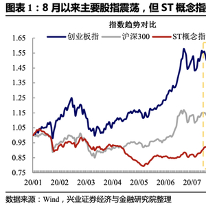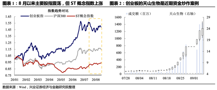 7月中旬至今主要股指和绝大多数行业指数均没有什么涨幅,但ST概念指数却悄然上行,而且在本周后半周的调整中极为坚挺,整体而言可以媲美近期表现最好的行业指数。实际上,在创业板注册制实施预期非常充分的情况下ST股逐渐退出舞台是一个非常坚实的长逻辑,而从2019年至2020年5月该指数持续走低也是证明,但显然在7月下旬过后这一情况有些变化,资金反而对市值极小、业绩较差的标的出现兴趣。与之相关的典型案例是创业板公司天山生物(虽然不是ST但基本面暂无研究价值,炒作前市值仅有16亿元左右),该标的在短短半个月内上涨超过300%,且频频在20%的涨幅上封板。