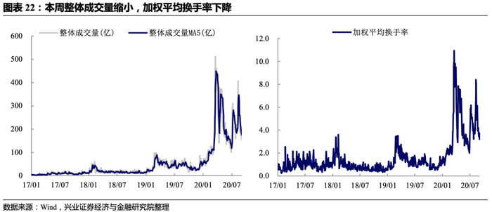 本周权益市场再现“前高后低”,美股白马的调整给A股带来一定压力。万得全A、沪深300等成交量继续缩小意味着“渐修复与弱增量”进入深水区,虽然所有人对A股中长期仍然乐观,但短期需要多看少动,毕竟正如前文所述,情绪和随之而来的资金面变化会对筹码集中的白马股带来重要影响。在此情况下,前期调整较多的科技股和估值底部的周期品(特别是金融)有望在此获得资金关注。