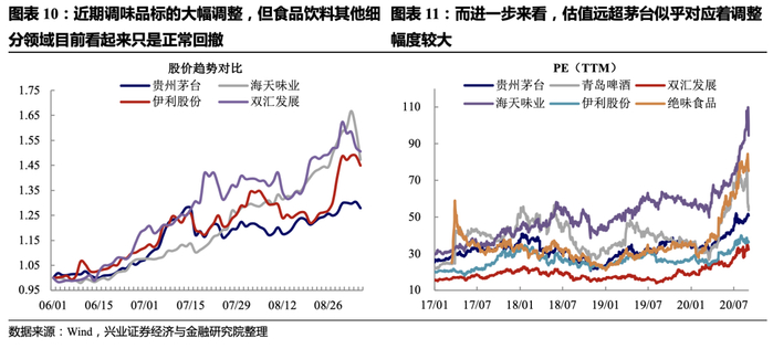 大部分估值已经达到历史高点的白马股均出现了大幅调整吗?从本周的情况看并非如此。光伏/建材/农业龙头隆基股份、东方雨虹、海大集团PE(TTM)周五收盘分别约34/42/54倍,本周后半周只是小幅调整。食品饮料行业中高估值白马受到影响的更大,不过相比之下贵州茅台、伊利股份、双汇发展要相对稳健,而估值超过茅台的海天味业、青岛啤酒、绝味食品回撤较多(周五对应过去十二个月PE为95/54/75倍)。当前食品饮料各个细分领域的龙头估值基本都在历史最高位置,这带来的困扰是难以通过经验判断安全边际。但考虑到贵州茅台仍是A股中盈利最为稳定,经营调节能力最强的公司之一,在情绪波动时可以尝试以其估值为锚。换句话说,如果3年业绩增速相比茅台(3年复合约60%)没有绝对优势,那么估值大幅超过茅台在市场情绪波动时就会比较危险。
