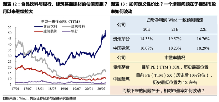 从行业比较视角出发,即使7月初低估值品种快速上涨但随后回撤明显,食品饮料和建筑、银行甚至建材的估值差距继续拉大(特别是8月中旬至9月初)。《变与不变——兼转债9月展望及8月回顾_0830》给出了一个比较预期收益率的框架(以下图的贵州茅台和中国建筑为例),即在市场震荡、资金“紧平衡”的情况下业绩占优的白马股性价比更高。