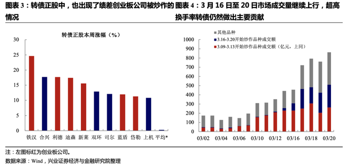 利用交易机制和过量资金赚取收益,这让转债投资者“不得不联想起”2020年3月出现的转债爆炒。彼时爆炒品种如横河转债、尚荣转债能够在单日贡献巨大成交量和价格波动,成为“投机场”。因此可以观察的现象是3月中旬中证转债成交量走势与全A指数明显背离,主要是炒作标的的贡献,而本周在万得全A成交量中枢继续回落的情况下创业板指波动与成交量同时放大,创业板综指更是强于创业板指,指向市场对小市值创业板标的偏好。