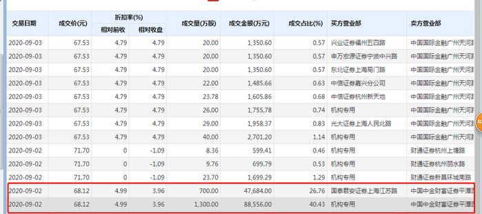 交易的卖出方为中国中金财富证券平潭西航路营业部,买入方分别为机构和国泰君安上海江苏路营业部,其中机构买入1300万股,成交额为8.86亿元;国泰君安上海江苏路营业部买入700万股,成交额为4.77亿元,两笔交易累计金额13.62亿元。