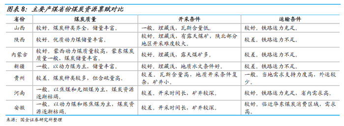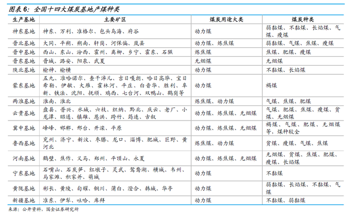 动力煤主要分布在神东基地、晋北基地、陕北基地、蒙东基地、新疆基地、宁东基地、黄陇基地,其中神东、晋北、陕北、蒙东、新疆、黄陇基地煤炭开采条件较好;炼焦煤主要分布在晋中基地、两淮基地、鲁西基地,晋中、鲁西开采条件较好、两淮基地地质构造偏复杂;无烟煤主要分布在晋东基地,晋东基地是我国最主要的无烟煤生产基地,且开采条件相对较好;云贵基地、冀中基地、河南基地煤炭种类齐全,云贵基地单井规模较小,冀中、河南基地开采历史长,矿井开采深度较深。