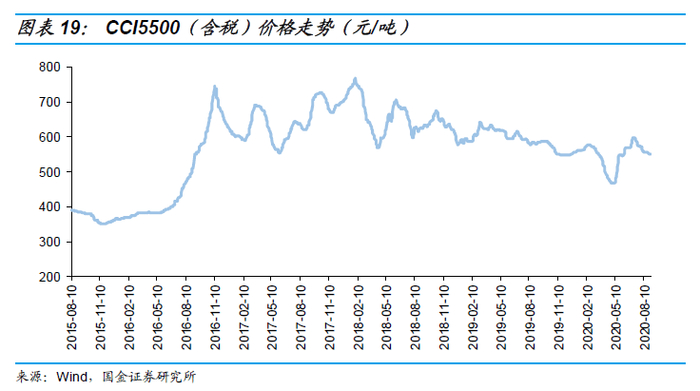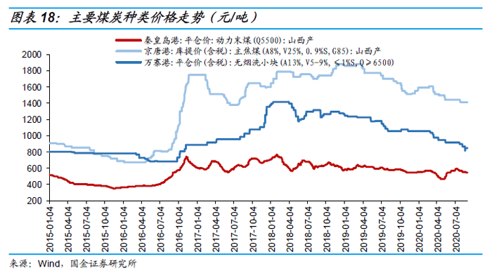 动力煤触底回升,炼焦煤无烟煤价格承压。3-5月,由于疫情影响,下游需求走弱,叠加进口煤炭的大幅增加,动力煤价格快速下跌,CCI5500指数一度下跌至469元/吨,是自2017年以来首次跌入蓝色区间下沿,5月以来,随着下游需求的回暖以及陕西内蒙古的限产,动力煤价格触底回升,目前已位于绿色区间,预计年内煤价再次大幅下跌的可能性不大;炼焦煤价格波动较小,整体呈下行趋势,4月煤炭运销协会发布倡议减产也对稳定炼焦煤价格起到了一定的作用;无烟煤方面,下游煤化工价格整体偏弱,加上原油价格的大幅下跌,无烟煤价格走势整体偏弱。