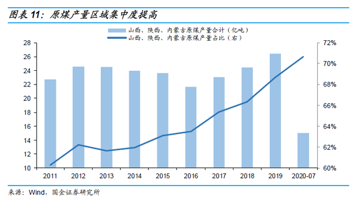 随着结构性去产能的推进,原煤总产量增加,2018年、2019年原煤产量分别增加4.53%、4.42%,区域集中度提高,河南、河北等省份煤炭资源逐步枯竭,开采条件较差,西南地区小矿井偏多、瓦斯含量高,而山西、陕西、内蒙古省份煤炭资源储量丰富且开采条件较好,煤炭产量占比大幅提升,截止2020年7月,三省份煤炭产量占比已达到70.65%,区域集中度明显提高。