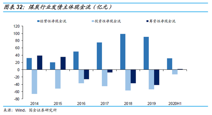 现金流方面,经营性现金流与盈利能力表现较为一致,2015年经营性现金流净额触底,随着去产能的推进,净流入逐渐增加,2019年有所下滑,2020年上半年由于疫情原因,煤价下跌,同比有所下滑;投资性现金流方面,由于煤企盈利逐渐好转,扩产意愿较强,投资性现金流整体呈增加的趋势;另外,煤企基本面情况的改善也降低了其外部融资的诉求,近年筹资性现金流均为净流出,2020年上半年有小幅流入。