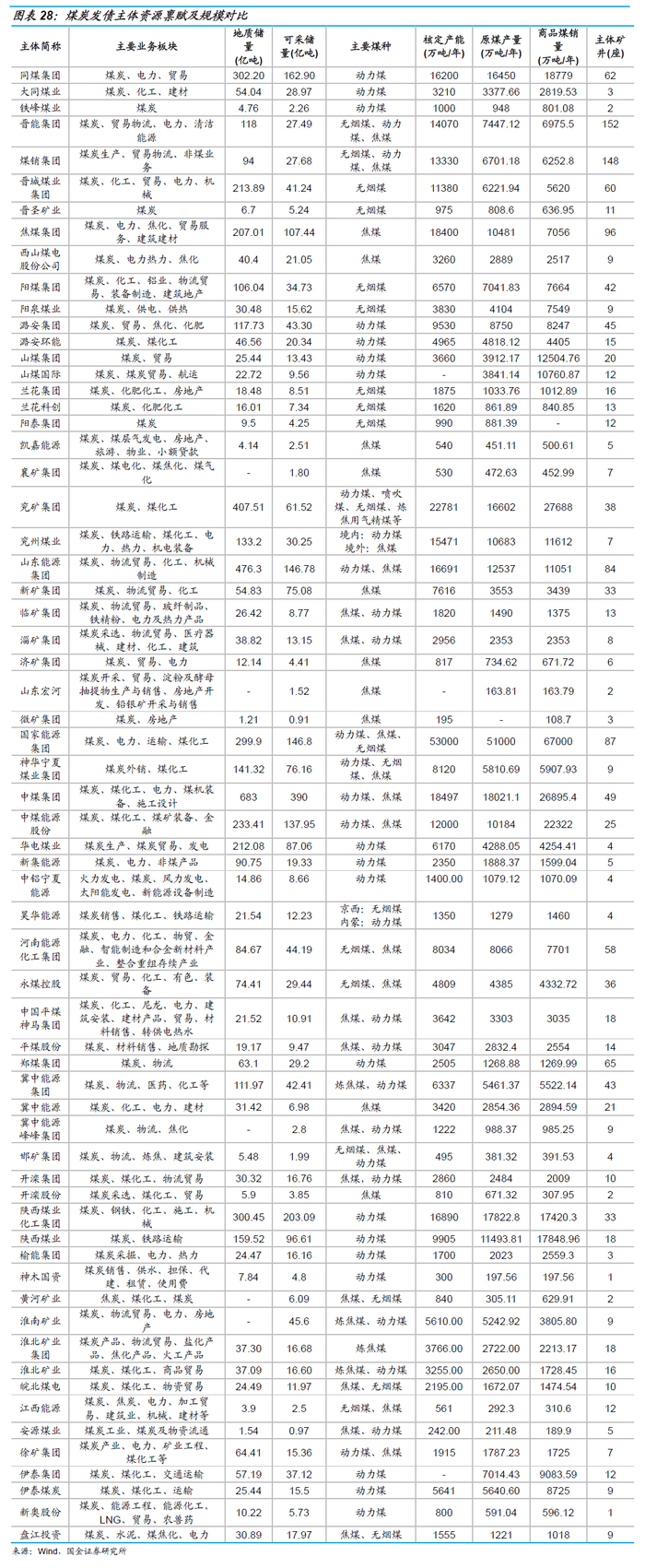 煤企属于资源型行业,资源禀赋方面,关注地质储量、可采储量、主要煤种、开采条件及区位运输条件,可采储量较地质储量相比更具有参考性,可采储量较多的企业主要位于山西、陕西、山东及部分央企,河北、河南、安徽地区煤矿开采时间较长,煤炭逐步枯竭;煤种方面、焦煤及无烟煤具有一定稀缺性,焦煤产量较多的企业有焦煤集团、山东能源、兖矿集团(海外煤矿)、冀中能源、开滦集团及平煤等,无烟煤产量较多的企业有晋城煤业集团、阳煤集团、豫能化等,另外高发热量的动力煤质量较高,如煤矿主要在蒙西、山西、陕西地区的煤企。