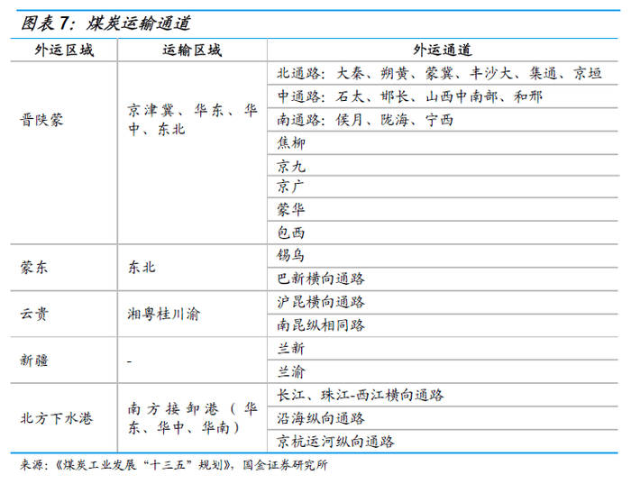 “九纵六横”的煤炭物流通道网络中,铁路运输通道包含“七纵五横”。主要产煤大省中,山西省煤炭运输通道相对完备,且运力充足,可通过大秦线、神朔黄线、瓦日线等铁路将煤炭运输至环渤海地区,再由水路通道沿海纵向通路运输至东南沿海港口;陕西省整体运力不足,横向运输路线神朔黄线为神华专用路线,纵向路线运力不足;内蒙古横向路线运力相对充足,纵向通路有包西线、蒙西至华中路线等,运力匮乏;新疆外运通道仅有兰新、兰渝纵向通路,且距离煤炭消费地区较远,运费始终是新疆煤炭成本的瓶颈;贵州外运通道为沪昆横向通路和南昆纵向通路,由于贵州煤炭主要供本地及周边省份需求,运力相对充足。2019年9月,浩吉铁路开通,完善了内蒙古、陕西等省份“北煤南运”的线路。