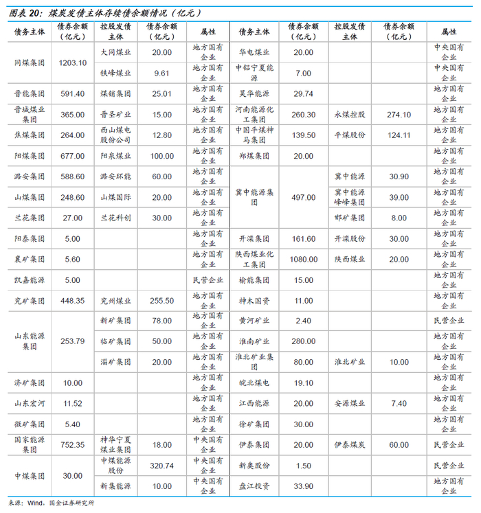 我们从经营情况及财务情况对存量煤炭行业发债主体情况进行了梳理,将主要的煤炭集团大致分成三个等级:1)国家能源集团、中煤集团、山西焦煤集团、兖矿集团、山东能源集团、陕西煤化工集团、晋城无烟煤集团,相关企业股东实力强,煤炭资源储备丰富且盈利能力较强;2)潞安集团、晋能集团、淮南矿业、淮北矿业、阳煤集团、同煤集团,其中潞安集团、阳煤集团、晋能集团、同煤集团煤炭储备具有一定优势且开采成本较低,淮南矿业煤炭储量丰富且盈利能力较强,淮北矿业煤种稀缺但开采成本较高;3)开滦集团、皖北煤电、冀中能源、盘江投资、伊泰集团、豫能化集团、平煤神马、永煤控股,煤炭资源逐步枯竭,开采成本偏高,债务压力较大。