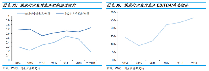 煤企的偿债能力方面,我们对其资本结构、债务结构及短期偿债能力和长期偿债能力进行分析。煤企资产负债率在2016年之后开始下降,到2020年中报,资产负债率下降至66.2%,债务率较前期大幅改善;债务结构方面,煤企债务普遍存在短期化的问题,短债占比逐年上升,今年上半年,短债占比略有下降;偿债能力方面,经营性净现金流及非受限货币资金对短债覆盖能力相对较差,今年上半年两个指标有所背离,经营性现金流净流入减少,非受限货币资金增加,长期偿债能力上,EBITDA对有息债务的覆盖程度逐年转好。