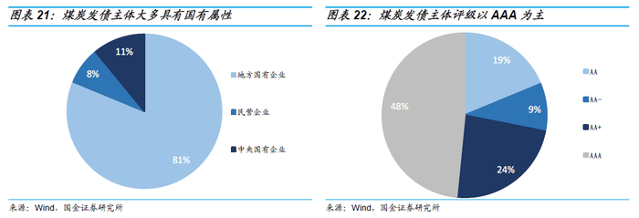 煤炭企业发债主体多为国企,外部评级较高。在64家煤炭企业发债主体中,央企和地方国企分别有7家和52家,合计占比92%,其余5家为民营企业,分别是伊泰集团及其子公司伊泰煤炭。煤炭企业大多数由国务院国资委或地方政府实际控制,外部评级普遍较高,AAA评级主体共计31家,占比48%,叠加煤炭信用债主要集中在高评级主体,AAA信用等级主体存量债券余额9070.23亿元,占比91.92%。