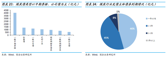 煤炭行业存续债券类型以中期票据、公司债为主。从存续债券类型角度看,一般中期票据、私募债及一般公司债余额占比分别为41%、14%和12%;从存续债券到期(含回售)分布情况来看,行业整体债券剩余期限集中在一年以内及1-3年,占存续债券余额的比重分别为46%和45%,短期内面临一定的偿付压力。