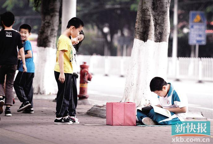 2014年8月31日 广州农讲所门口 为了减轻家里负担,12岁的朱阅阳在开学前一天还在路边乞讨。