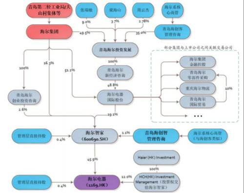 海尔集团(纯集体所有制)→海尔电器国际→海尔智家(持股40%,其中高管占6%)→海尔电器(持股60%,其中高管占15%,集团持有20%,A股社会股东持有15%)。