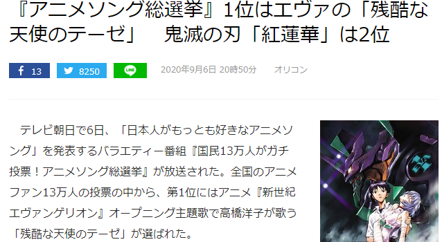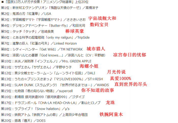 ·地位似乎是难以撼动,《新世纪福音战士》的主题歌《残酷的天使纲领》登顶夺得第一名,而或许《鬼灭之刃》漫画异常火爆的原因,主题歌《红莲华》战胜众多强手位居第二位,更多排名如下: