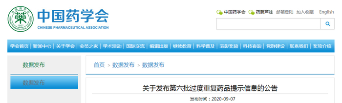 2019年9月18日,中国药学会发布关于第五批过度重复药品提示信息的公告。