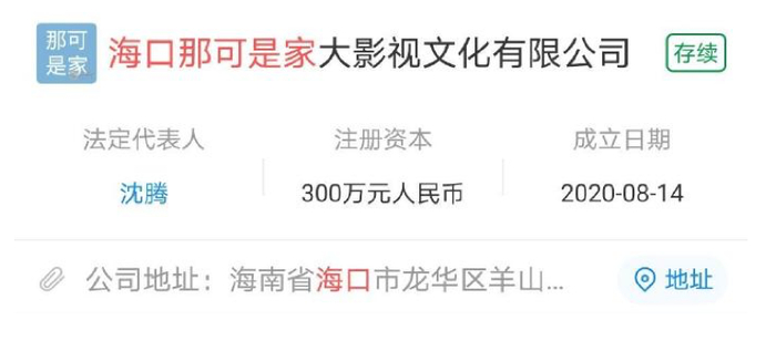 公司名叫:海口那可是家大影视文化有限公司,法人:沈腾。