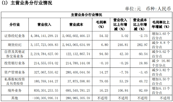 报告期内,中国银河证券经纪业务实现收入43.84亿元,同比增加5.02%,毛利率同比增加3.65个百分点;期货经纪实现收入31.58亿元,同比增加246.81%,毛利率同比减少8.8个百分点;自营及其他证券交易业务实现收入22.20亿元,同比增加42.30%,毛利率同比减少0.62个百分点;私募股权投资及另类投资实现收入1.81亿元,同比增加53.29%,毛利率同比增加0.50个百分点;境外业务实现收入8.30亿元,同比增加106.84%,毛利率同比增加6.15个百分点;投资银行业务实现收入2.15亿元,同比减少0.26%,毛利率同比减少16.80个百分点;资产管理业务实现收入3.27亿元,同比减少7.76%,毛利率同比减少3.82个百分点。