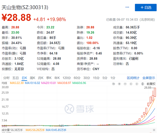 监管曝光、停牌核查以及公司自认风险,都没能阻挡被股民戏称为“天山老妖”的天山生物股价的暴涨。近期天山生物走势成“妖”:先是连续三个交易日收获10%涨停板,接着连续四天封20%涨停板。在9月2日复牌后的两个交易日,又连续两日收获20%涨停板。
