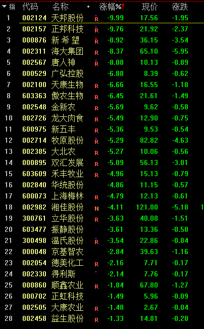 今日,猪肉股集体重挫,领跌A股。天邦股份跌停,新希望、唐人神、天康生物、正邦科技、海大集团、傲农生物等跌幅居前。