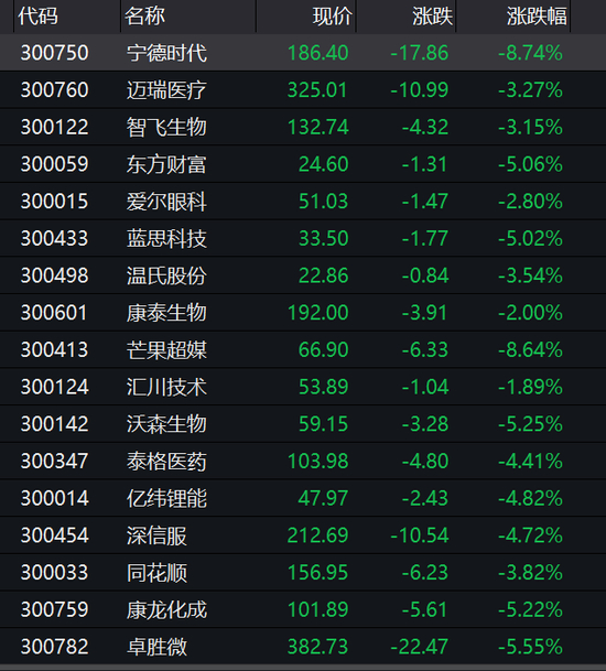 今天创业板权重股集体重挫,宁德时代跌近9%。芒果超媒跌逾8%,蓝思科技、东方财富跌逾5%,迈瑞医疗、温氏股份跌超3%。