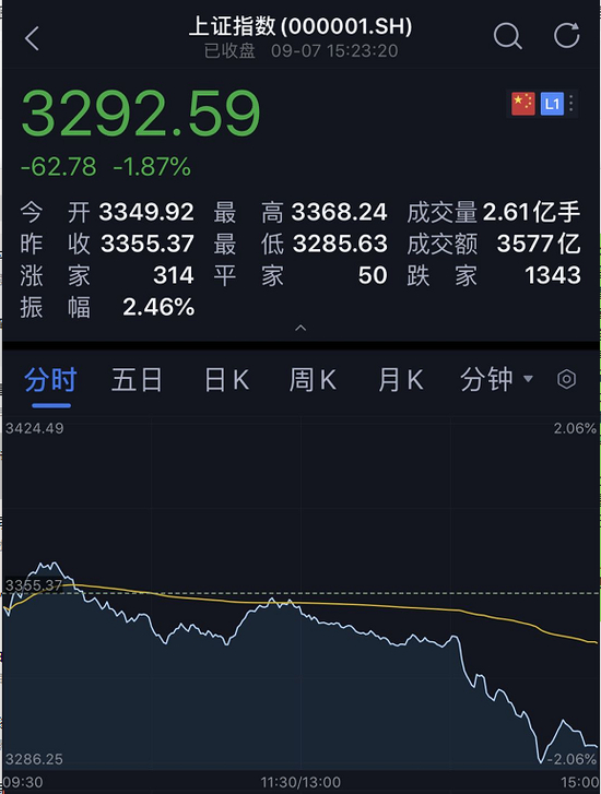 9月7日,A股三大股指全天震荡走低,指数午后放量单边下行,尾盘加速跳水。截至收盘,沪指跌1.87%失守3300点,深证成指跌2.73%,创业板指跌3.33%。