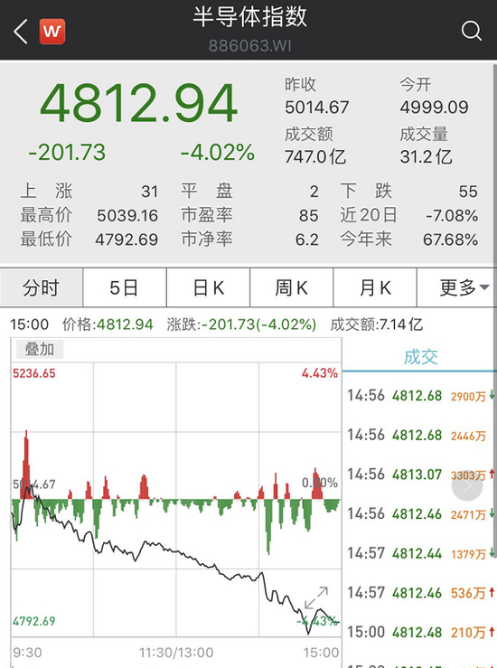 中芯国际的暴跌,也带动了其他半导体相关个股的剧烈波动。