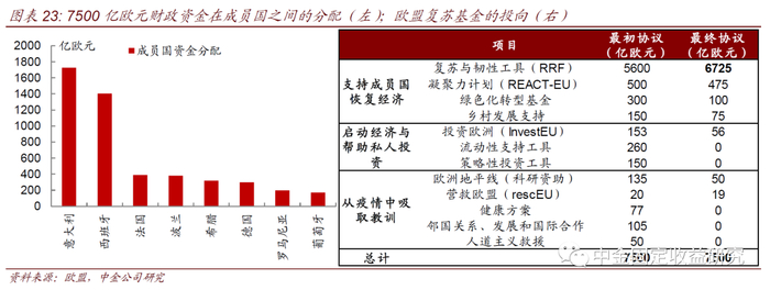 3)7月 21 日欧盟27国最终就规模 7500 亿欧元的欧盟复苏基金计划达成协议,以帮助遭受新冠疫情重创的欧盟成员国恢复经济,其中3900 亿欧元将以赠款形式发放,其余 3600 亿欧元则以低息贷款形式发放。