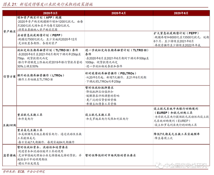 紧急资产购买计划(PEPP): 3月18日,为应对疫情,欧央行推出了一个临时性的,购买上限高达7500亿欧元的流行病紧急购买计划(PEPP),购买将持续到2020年底。PEPP购买计划的购买范围包括了原有的购买计划的所有资产类别,并且加入了不在原计划中的希腊政府债务。并将公司部门购买计划(CSPP)下的合格资产范围扩大到非金融商业票据,使所有信用质量足够的商业票据都可以在PEPP和CSPP下购买,通过调整抵押品框架的主要风险参数来放宽抵押品标准等来缓解信用风险。 6月4日,欧央行宣布将PEPP规模增加6000亿欧元至1.35万亿欧元。延长PEPP期限至2021年6月底,并将再投资期限至少延长至2022年底。