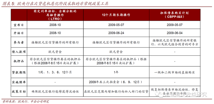 次贷危机期间,欧央行综合运用各类货币政策工具,为市场注入大量流动性,缓解近乎枯竭的流动性。一是降息:连续7次下调基准利率,将主要再融资操作利率由2008年10月4.25%降至2009年5月1%的水平。二是延长再融资操作(LTRO)期限;并且LTRO实行固定利率全额配给;此外放宽金融机构再融资抵押品评级要求。三是推出首个资产购买项目——担保债券购买计划(CBPP1),为债券市场提供流动性。四是与全球主要货币当局进行货币互换。