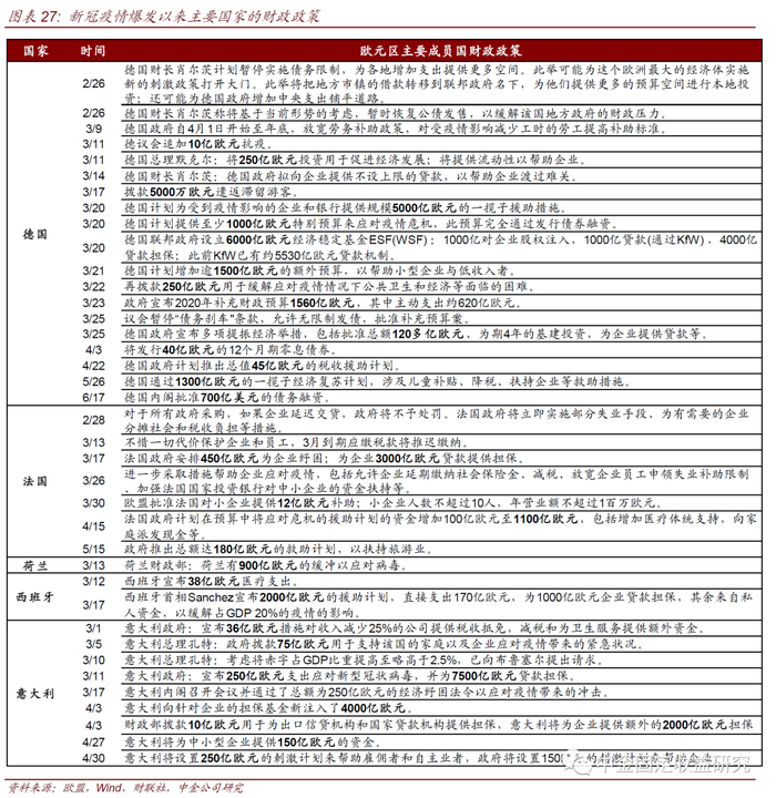 法国宣布规模约1100亿欧元的救助案;意大利宣布约250亿欧元救助,并为7500亿欧元贷款担保;西班牙宣布总价值2000亿欧元的救助案。整体看,财力相对雄厚的德国和法国救助规模较大,而意大利和西班牙等政府债务较高的国家救助规模受限。