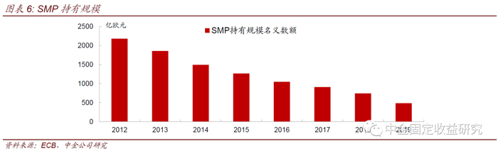 证券市场计划(SMP):2010年5月,欧央行推出了SMP购债计划,从二级市场购买购买成员国的公共和私人部门债务。SMP公开市场操作之一,旨在通过干预债市,来解决严重阻碍欧央行货币政策传导机制的问题。SMP可以推升国债需求并降低收益率,降低成员国融资成本。SMP启动后,截至2011 年2 月末,欧央行已从希腊、爱尔兰、葡萄牙等重债国购买了共计740 亿欧元的政府债券。2011 年8 月,面对严重的欧债危机态势,为了稳定债券市场,欧央行又重启SMP,主要以意大利和西班牙等重债国的政府债券为主。2012 年9 月,欧央行推出“直接货币交易计划(OMT)”,同时终止了SMP。截至2012年末,欧元体系央行持有的SMP价值为2180亿元。截至2020年8月21日,SMP持有量剩余345.69亿欧元。