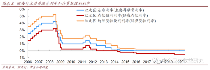 欧央行主要通过利率走廊机制调控市场利率,边际贷款便利利率、主要再融资利率、存款便利利率,分别为利率走廊的上限、中间、下限。其中存款便利利率指银行存放在欧央行的过剩流动性的隔夜利率,是下限,也是负利率实施的对象(类似于我国的银行超额储备金存放在央行,最差的情况如钱没地方放也没有足够的金库,银行可以把钱存在央行,进而市场利率的下限在于此);边际贷款便利利率是银行从欧央行隔夜借款的利率,是上限,即资金紧张时银行可从中央银行借款,进而资金利率不会高于此。主要再融资利率是银行从欧央行获得常规流动性的利率。