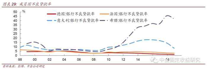 负利率初期,对信贷扩张的效果并不显著,但随着欧央行QE 的推进,如持续的购买资产、LTRO 等,叠加下调政策利率等,欧元区信贷有所扩张,M3回升至。且根据ECB 公布的数据,从M3各分项的同比增速来看,一般金融机构M3 同比增速在2015 年年末为10.8%,非金融企业为5.4%,居民为3.8%,但保险公司与养老基金在M3 中贡献的同比为-2.3%。此外,家庭部门消费信贷同比从15 年上半年的负增长回升至1.8%附近,房贷同比增速至2.4%附近;非金融企业贷款同比增速也走出长期的负增长,增至0.7%左右)。且从预期指数来看,欧元区居民信贷需求最先回升,最后企业信贷需求回升;与此同时,银行信贷审核标准难度有所下调。从结构上来看,以德国的信贷为例,其房贷同比增速在2007-2009 一度负增长,随后回复正增长,且在2014年至今一直保持3%以上的增速;居民消费贷需求一度恶化,但在2015 年9 月转正;而非金融企业信贷同比增速也在15 年年度恢复正增长。不过,不良贷款率分化较大,受债务问题困扰的成员国不良率在较长时间维持高位,国家之间分化较大,希腊的不良率从18年才开始回落。