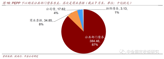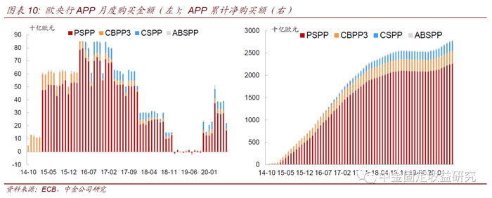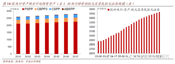 扩张资产购买计划(EAPP): PSPP和CSPP。2015年1 月,欧元区的年通胀率仍接近-1%,,资产购买计划和负利率并未显著改善通缩局面。1月22 日,欧洲央行宣布扩张资产购买计划(EAPP),其中包括2015年3月启动的大规模的公共部门采购计划(PSPP)以及2016 年6 月启动的企业部门资产收购计划(CSPP)。PSPP是一个每月高达500 亿欧元的政府和超主权机构债务的购买计划,目标资产期限为2年至30 年。这样连同之前启动的ABSPP 和CBPP3 计划,欧洲央行每月购买约600~800 亿欧元的不同类型的债券资产。PSPP 将覆盖欧元区金融资产的20%。按照风险共担原则,EAPP 的损失由成员国各国央行和财政部承担,以避免风险从高债务风险的国家转移到中心国家。2018年6月由于经济稳步复苏,欧央行宣布于12月停止APP新增资产购买;2019年11月再次重启200亿欧元/月的资产净购买。截至2020年7月末,欧央行累计净购买的APP资产达到2.797万亿欧元。