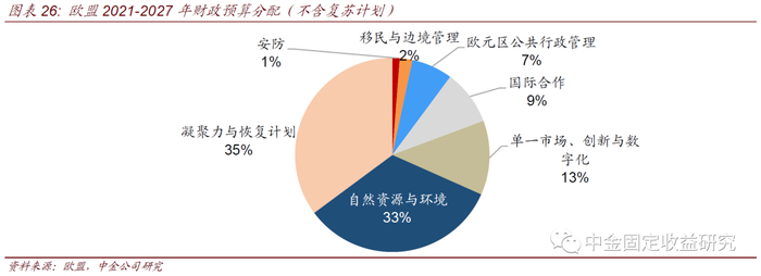 4)会议同时通过了2021-2027年财政预算计划,总规模高达1.84亿欧元,远超上期。此前欧委会制定了1.1万亿预算案,再加上复苏基金,欧盟2021-2027年预算将达到1.85万亿欧元,刺激规模超过了二战后的“马歇尔计划”,远超2014-2020年的1.03万亿欧元。从该计划的构成来看,主要包括经济复苏、自然环境与资源以及其他卫生、改革、农业等领域的长期投资计划。其中3564亿欧元将用于自然资源与环境的目标。