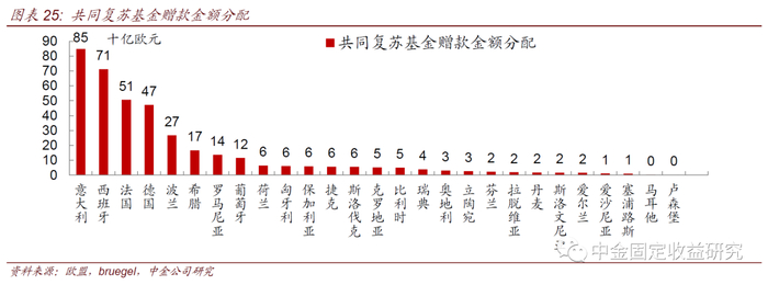 相较最初提议,最终协议投向RRF的规模较最初提议有所增加,最初是5600亿欧元,最终协议是6725亿欧元;虽然贷款份额上升,但其支付利率仍非常低,意大利、西班牙等国能获得的贷款利率将低于自主发行主权债筹措;虽然最终协议体现出了部分让步,但通过发行“欧盟债券”的方式为复苏基金筹资象征着欧盟向财政风险分担迈出关键一步,是推动欧盟一体化的又一里程碑事件。