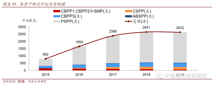 资产购买计划(CBPP3和ABSPP):为配合负利率政策,2014年10月起欧央行引入了两项初始计划期限为两年的风险资产收购计划,包括担保债券购买计划(CBPP3)和资产支持证券购买计划(ABSPP)。CBPP3于2014 年10月启动,原定持续至2016 年9 月。在此期间,欧洲央行每月购买总额约100 亿欧元的抵押债券和资产支持证券(债券风险等级放宽至BBB-)。截至2016年末,CBPP3 净收购余额已达到2035亿欧元,远远超过上两次收购计划的总和。ABSPP于2014 年11月开始,欧央行购买资产支持证券(ABS),该计划旨在通过鼓励银行将信贷证券化后转售来增强信贷周转并刺激信贷扩张。