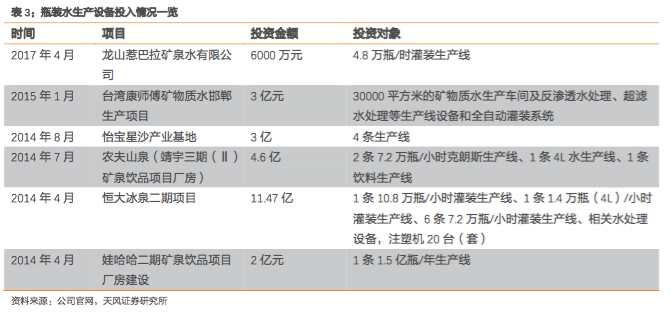 农夫山泉说过‘我们不生产水,只是大自然的搬运工’。那想要‘搬水’,就要建立生产线,对水进行过滤等基本处理和包装。瓶装水厂商一般需要配置过滤杀菌设备、包装设备等生产线。这些生产线设备初期投入规模较大,例如一套较为先进的德国克朗斯矿泉水生产线设备造价约8000 万元。