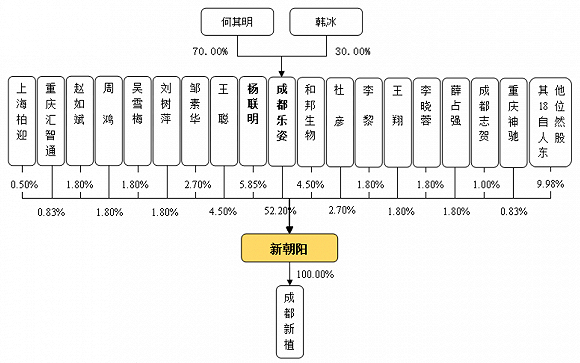 新朝阳成立的时间不短,其成立日期为1999年5月27日,迄今超过20年,注册资本6000万元,控股股东成都乐姿,实际控制人何其明、韩冰(夫妇俩合计持有52.2%的股份)。