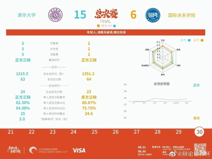 8.30 | 【决赛】 辩题:年轻人,请乘风破浪/稳住别浪 持方:正方 清华大学15:6胜国际关系学院 上场队员:施晨希,任泽禾,李翔,于江浩 最佳辩手:李翔 |