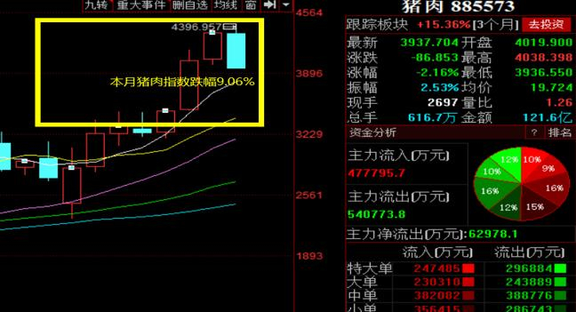 从图中来看,新希望股价出现阶段性高点42.2元是在上周三,而上周四和周五新希望股价只分别下跌了2.62%,1.22%,而到了本周,股价开始快速下杀,从时间节点看,唐人神董事长陶一山的言论自然产生了一些影响,而且不仅是新希望,整个猪肉板块都开始加速下跌:从猪肉指数来看,本月跌幅已经超过9%,几乎所有的猪肉股都在大跌,某种程度上,说唐人神董事长一句话直接带崩了一个板块似乎也成立。