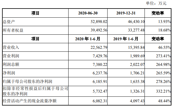 2020年1-6月,公司营业收入2.26亿元,较去年同期增长46.55%;归属于母公司所有者的净利润6185.91万元,同比增长278.26%;扣除非经常性损益后归属于母公司股东净利润5732.47万元,较去年同期增长332.21%;经营活动产生的现金流量净额6082.31万元,同比增长48.44%。
