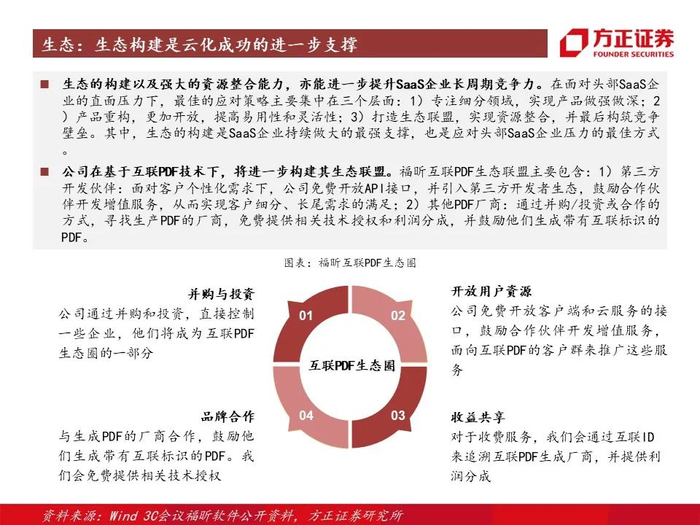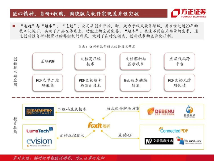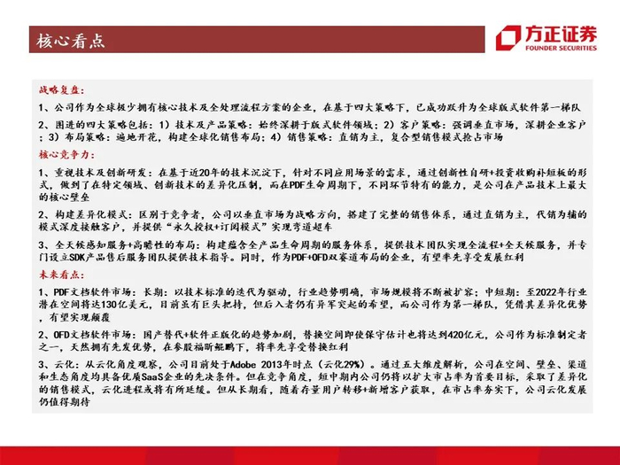 1、重视技术及创新研发:在基于近20年的技术沉淀下,针对不同应用场景的需求,通过创新性自研+投资收购补短板的形式,做到了在特定领域、创新技术的差异化压制,而在PDF生命周期下,不同环节特有的能力,是公司在产品技术上最大的核心壁垒;