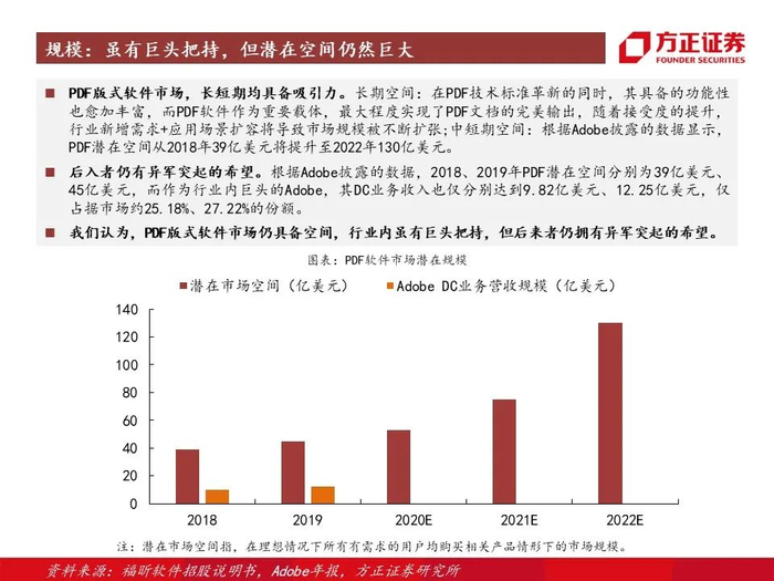 1、PDF文档软件市场:长期:以技术标准的迭代为驱动,行业趋势明确,市场规模将不断被扩容;中短期:至2022年行业潜在空间将达130亿美元,目前虽有巨头把持,但后入者仍有异军突起的希望,而公司作为第一梯队,凭借其差异化优势,有望实现颠覆 ;